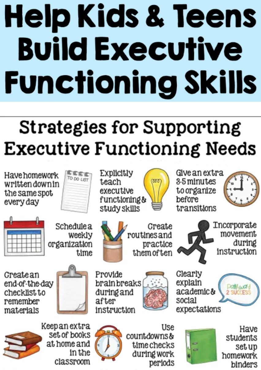 Time Management: preventing "time blindness." with prior scheduling Emotional Control: Regulating feelings so there is a lack of focus on tasks. Organization: Managing physical space and informational space.